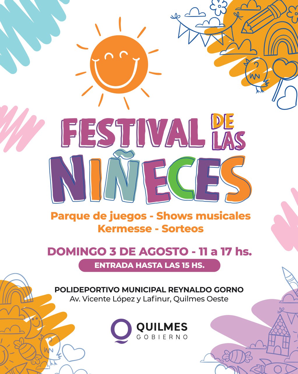 El Municipio de Quilmes invita a las familias quilmeñas a participar este domingo 3 de agosto, de 11 a 17, del festival por el Día de las Niñeces, que se realizará en el “Parque de Juegos” del Polideportivo Municipal “Reynaldo Gorno”, ubicado sobre el bulevar Omar Indio Gómez -ex Vicente López- y Lafinur, en Quilmes Oeste, con entrada libre y gratuita (hasta 15 se permitirá el ingreso de vecinos y vecinas al lugar).