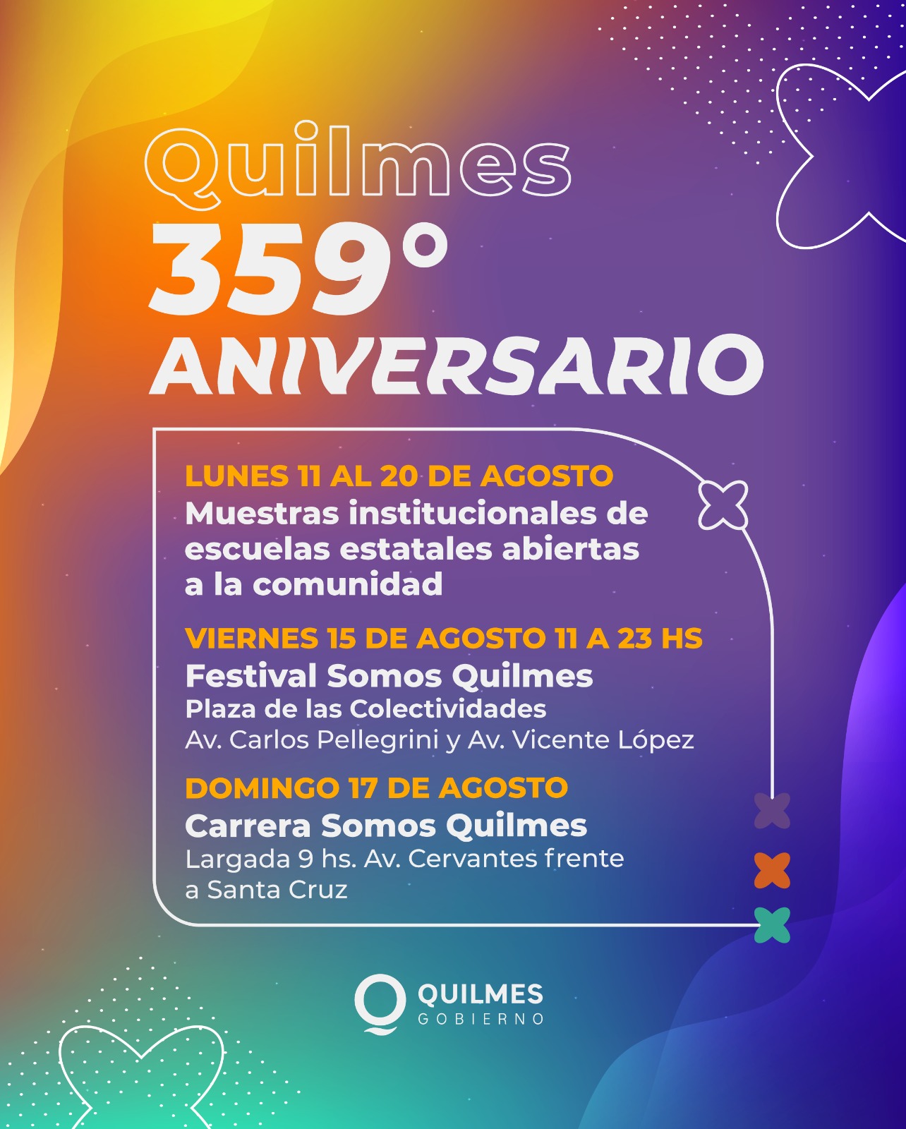 Con motivo del 359º aniversario de la ciudad de Quilmes que se celebrará el próximo jueves 14 de agosto, se llevarán a cabo diferentes propuestas recreativas, deportivas y culturales a lo largo de todo el mes, entre las que se encuentran shows artísticos y musicales en vivo en la plaza De las Colectividades, la Copa Ciudad de Quilmes y la Carrera Somos Quilmes, entre otras.
