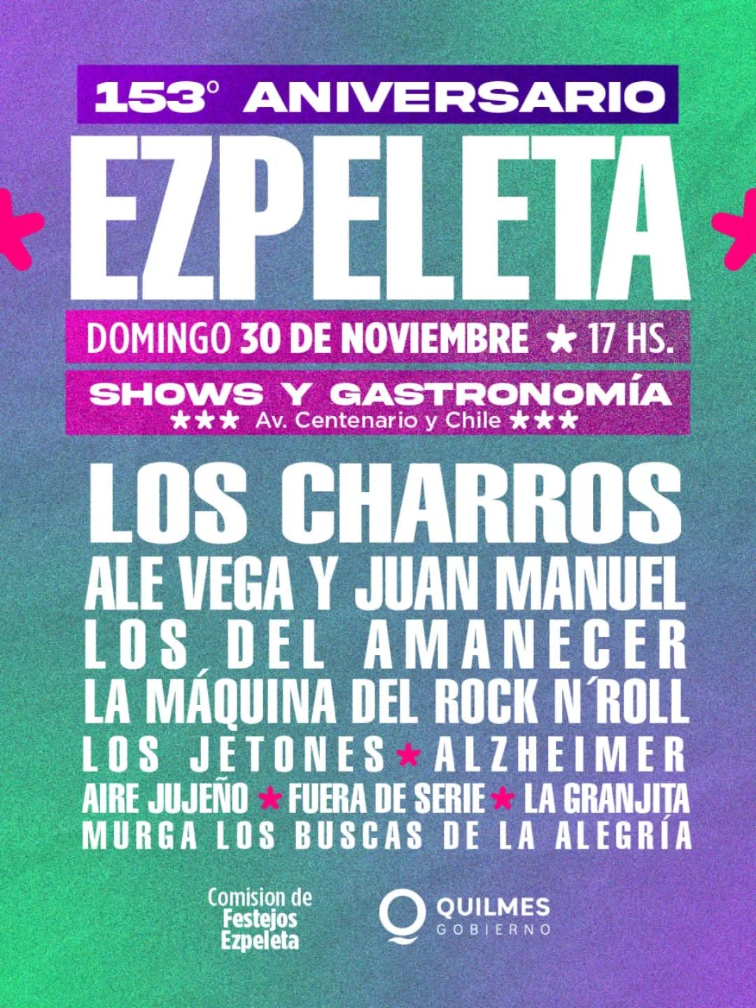 El Municipio de Quilmes invita a los vecinos y vecinas de todo el distrito a los festejos por el 153º aniversario de Ezpeleta, que se desarrollarán el domingo 30 de noviembre, con diversas actividades por la tarde-noche, con entrada libre y gratuita, y contará con ferias de emprendedores, gastronómica y una nueva edición del Festival Somos Quilmes, con artistas y música en vivo, que tendrá el cierre estelar con la presentación de Los Charros.
