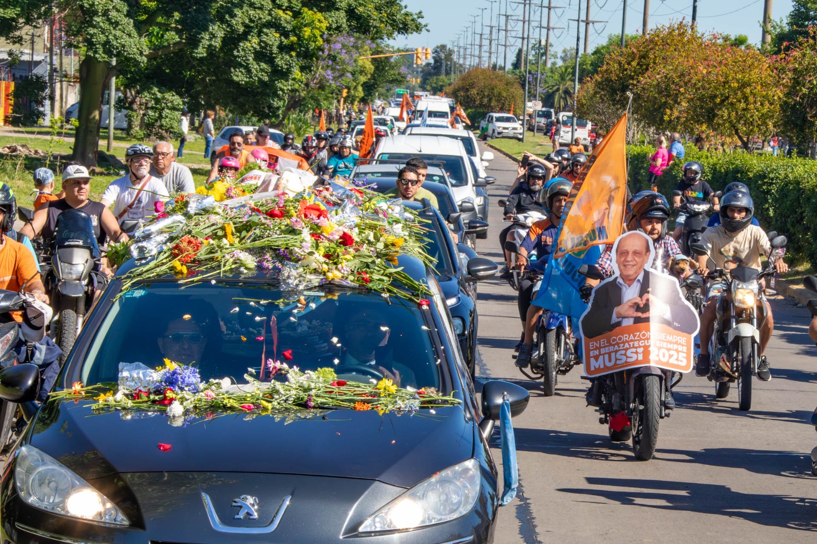 Durante el recorrido, conformado por una innumerable cantidad de vehículos -entre autos, motos y hasta bicicletas-, los y las asistentes flamearon banderas argentinas y naranjas (color representativo del distrito), exhibieron carteles y entonaron característicos cánticos en su memoria.