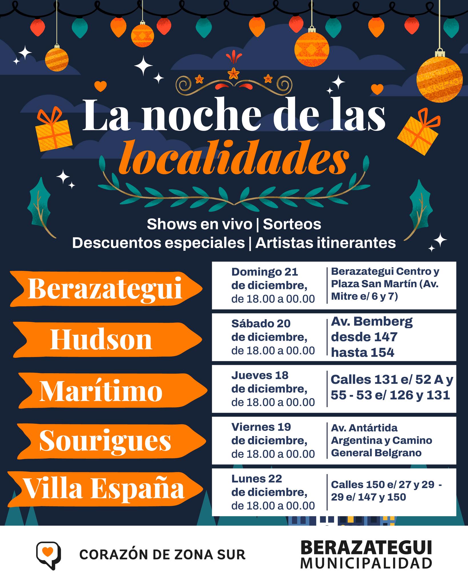 Los barrios de Berazategui se están preparando para vivir jornadas llenas de música, gastronomía, comercio local y actividades para toda la familia con la Noche de las Localidades. Habrá shows en vivo, sorteos, descuentos especiales y artistas itinerantes, entre otras atracciones. Todas ellas en el horario de 18 a 00.