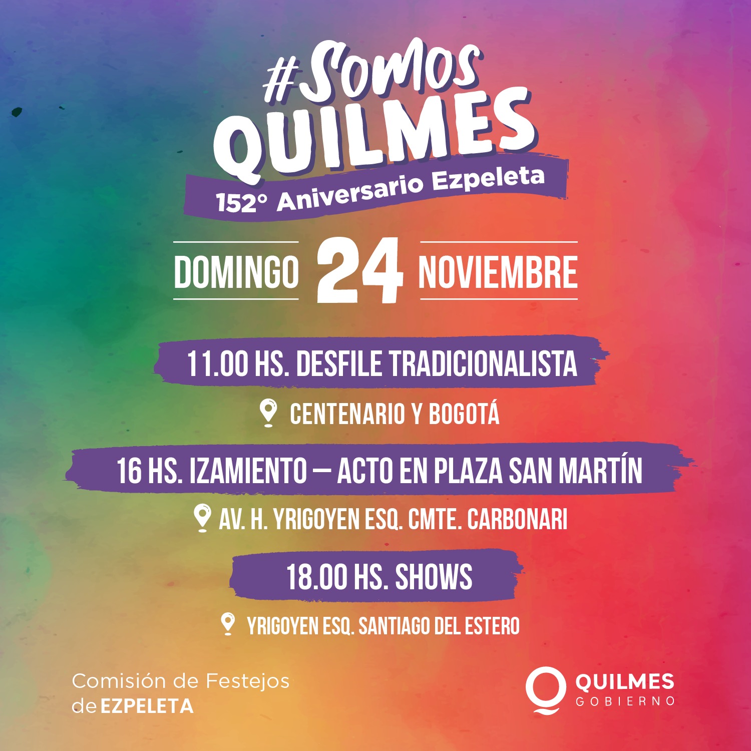 El Municipio de Quilmes invita a las y los vecinos a los festejos por el 152º aniversario de Ezpeleta, que se desarrollarán el domingo 24, a partir de las 11, y que continuarán hasta la noche con distintas actividades libres y gratuitas para toda la familia, en el marco del festival Somos Quilmes.