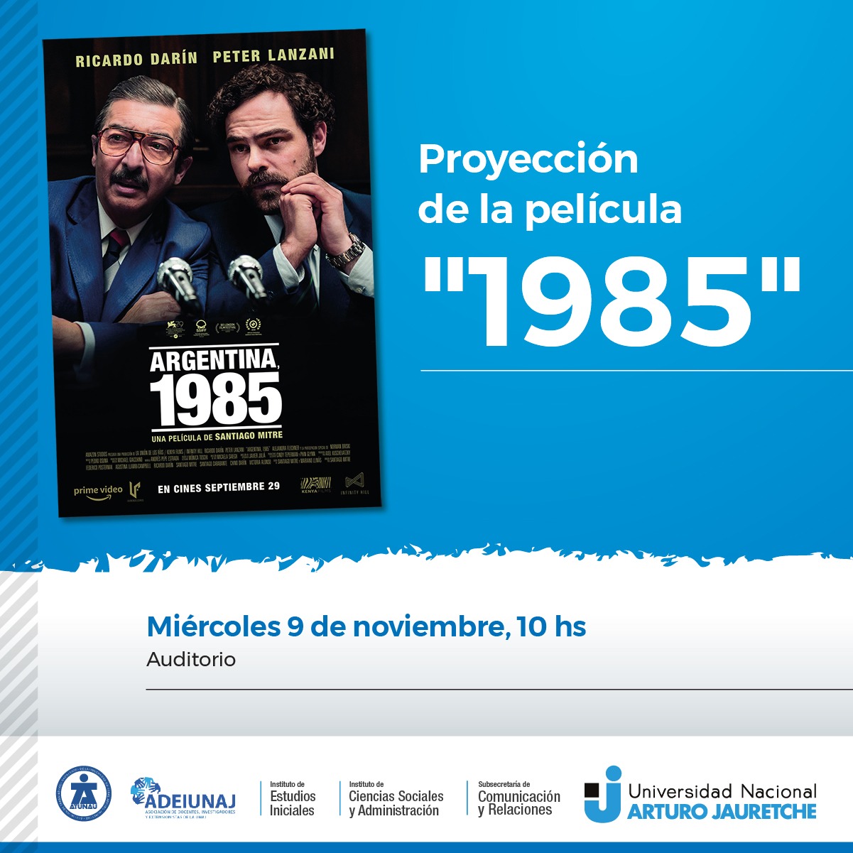 El próximo miércoles 9 de noviembre a las 10 vas a poder ver la película "Argentina 1985" en la Universidad Nacional Arturo Jauretche. La proyección será con una pantalla gigante en el Auditorio de la casa de altos estudios ubicada en Av. Calchaquí 6200, Florencio Varela.